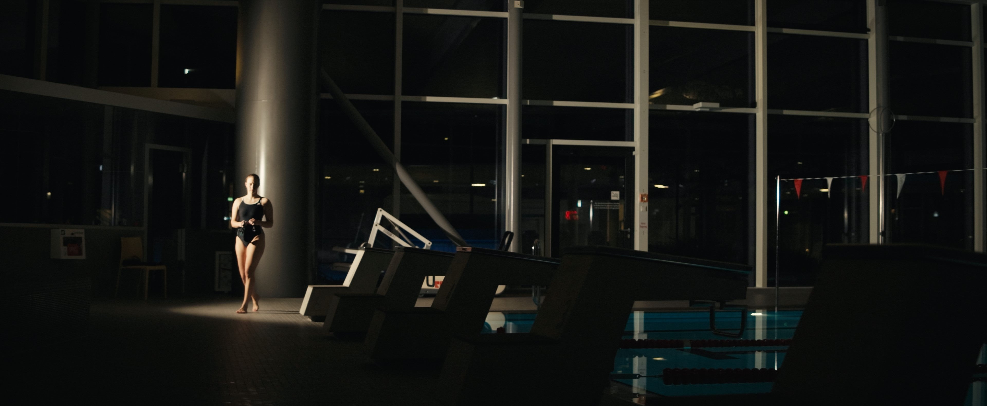 Für kinoreife Aufnahmen gibt es immer ein paar kleine Grundregeln, die man beachten sollte. Hierzu zählt unter anderem die Belichtung. In einer Schwimmhalle die von Glas umringt ist, ist das manchmal gar nicht so einfach. Es kann ganz schnell passieren, dass sich die Softbox im Glas spiegelt und man diese Spiegelung in den Aufnahmen sieht. Nach ein paar Anläufen hat es aber geklappt.